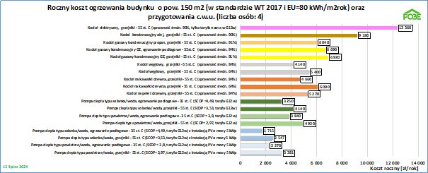 Rys. 2. Przykładowy roczny koszt ogrzewania istniejącego budynku jednorodzinnego o pow. ogrzewanej 150 m2, poddanego termomodernizacji do standardu WT 2017 (EU 80 kWh/(m2 · rok)), wraz z kosztem przygotowania ciepłej wody użytkowej dla 4-osobowej rodziny. Dane uwzględniają koszty energii i paliw w III kw. 2024 r.