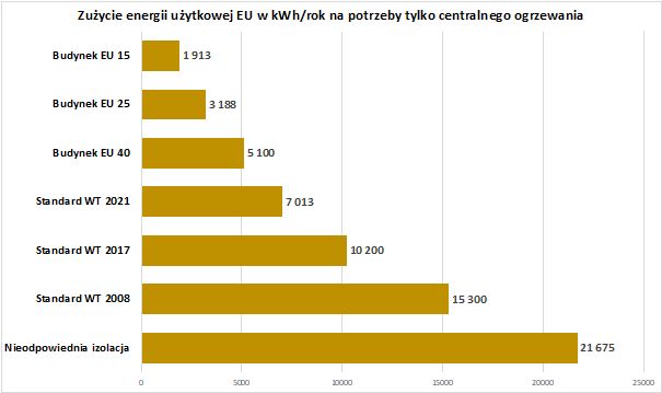 Rys. 1. Różnice w zużyciu energii użytkowej na ogrzewanie budynków, liczone w [kWh/rok], zależnie od ich standardu energetycznego. Założono, że powierzchnia ogrzewana wynosi 150 m2.